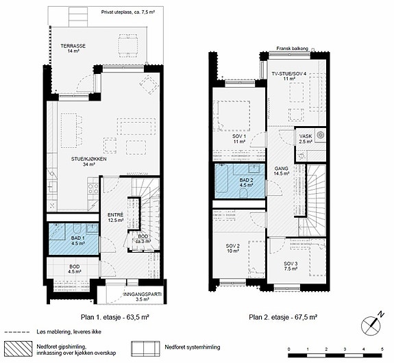 Generell takhøyde er ca. 2,60 m. Det blir nedforet himling på bad og i entré, i tillegg vil det bli lokale nedforinger/innkassinger