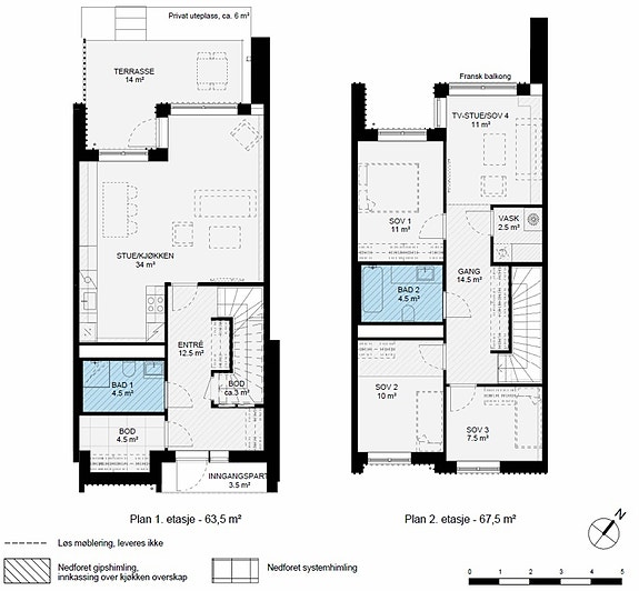 Generell takhøyde er ca. 2,60 m. Det blir nedforet himling på bad og i entré, i tillegg vil det bli lokale nedforinger/innkassinger