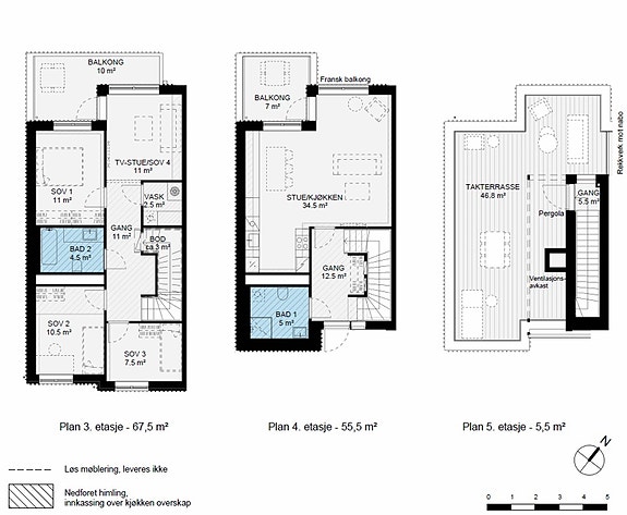 Generell takhøyde er ca. 2,60 m. Det blir nedforet himling på bad og i entré, i tillegg vil det bli lokale nedforinger/innkassinger