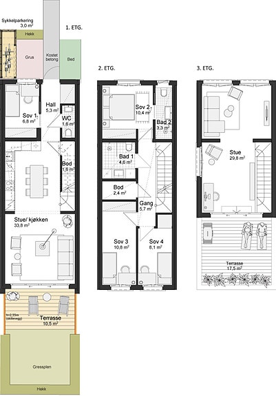 3-plans rekkehus med flott takterrasse, åpen stue- og kjøkkenløsning med direkte utgang til både terrasse og hage på bakkeplan. Det er 4 soverom, to bad og wc og loftstue. Balansert ventilasjon sørger for godt inneklima og lave kostnader til oppvarming. Ny bolig kommer med fem års reklamasjonsrett og oppfølging fra utbygger. Boligen selges inkl. 1 parkeringsplass. Forutsatt ledige plasser kan ekstra parkeringsplass i garasjekjeller kjøpes. Ta kontakt med selger for mer informasjon.