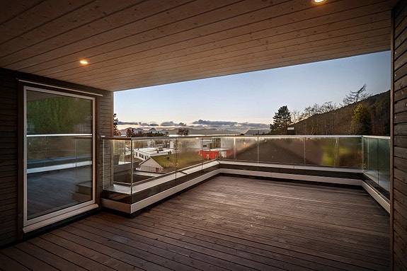 Gulv på terrasse er impregnert terrassebord. Glassrekkverk type Q-railing.