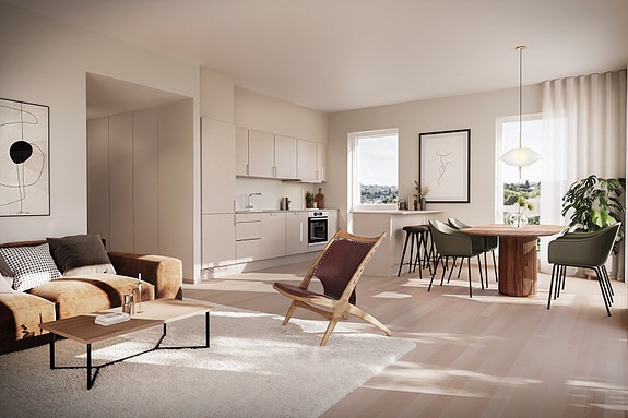 - Åpen stue/kjøkken løsning på ca 33,6m2