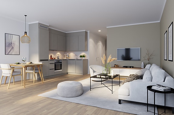 En 2‑romsleilighet består av åpen stue- og kjøkkenløsning, to skyvedører inn til soverom med walkin closet, romslig bad og entré. Leiligheten er perfekt for deg som skal kjøpe din første bolig eller deg som bor alene og som ønsker en ny leilighet med god kvalitet.