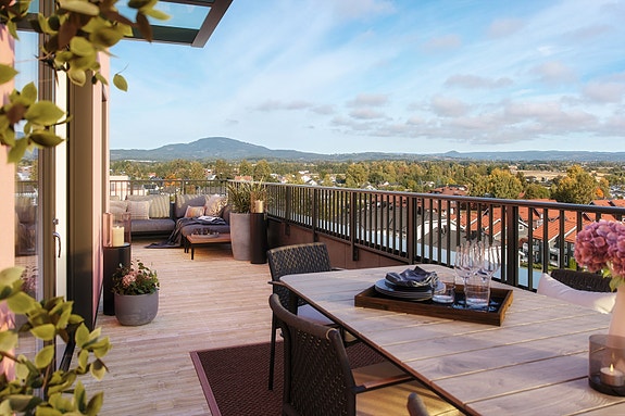 Kunne du tenkt deg å nyte fine sommerdager fra egen takterrasse? På denne takterrassen er det godt med plass til flere hyggelige sittegrupper.