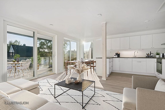 Leiligheten har to romslige soverom som gir god plass til både familie, gjester eller hjemmekontor. Den åpne stue- og kjøkkenløsningen skaper et naturlig samlingspunkt, med store vindusflater som slipper inn rikelig med dagslys og gir en luftig atmosfære. Fra stuen har du direkte utgang til en markterrasse, perfekt for rolige morgener med kaffe eller hyggelige kvelder med venner. Carport og boder.