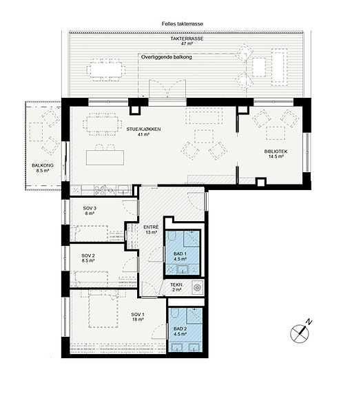 Terrasser, balkonger og takterrasser leveres med tremmegulv i impregnert treverk.