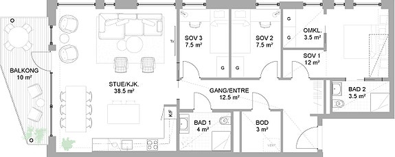 Leiligheten planlegges med lyst tregulv, generøs takhøyde og store vindusflater. Det leveres vannbåren varme i gulv. Balansert ventilasjon sørger for godt inneklima og lave kostnader til oppvarming. Leiligheten inneholder entré/gang med god plass til garderobe, 2 soverom hvor hovedsoverom har eget omkledningsrom og bad, bod, bad nr. 2 og en åpen stue/kjøkkenløsning med utgang til balkong.