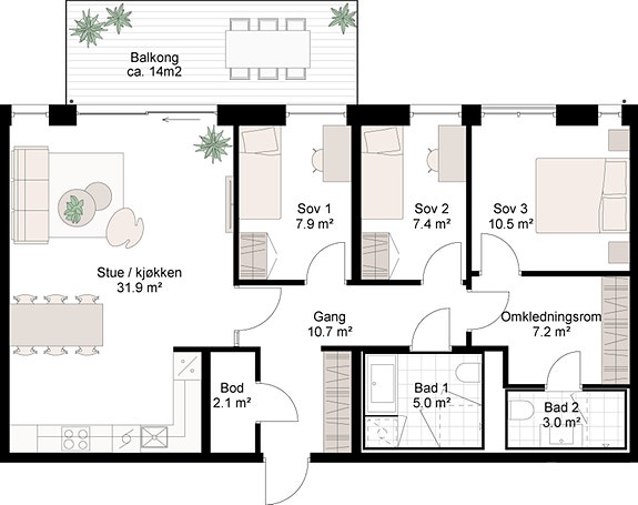 Lys 4-roms leilighet med store vindusflater og skyvedør ut til stor balkong. Leiligheten har åpen stue- og kjøkkenløsning med plass til både spise- og sofagruppe. Tre soverom hvorav hovedsoverom har eget bad og omkledningsrom. Romslig gang med praktisk bod og god plass til garderobe.