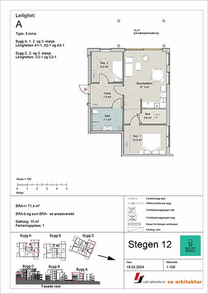 Stegen 12 datert 20.03.2024. Det opplyses om at 3D og 2D-tegninger er illustrasjoner og at så vel uteareal som innvendig areal kun er illustrert og ikke på noen måte danner grunnlaget for avtalen eller er bindende for selger. For data som danner grunnlaget for avtalen se leveransebeskrivelse Stegen 12 datert 20.03.2024 og bygningstegninger.