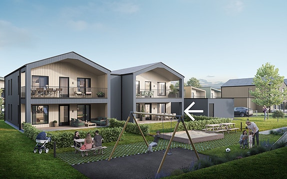 Lettstelt leilighet i 1. etg. som kan leveres med opp til 3 soverom. Stor, skjermet og solrik markterrasse på hele 18 m2 i tillegg til eget hageareal. Pil markerer leiligheten. Illustrasjonsbilde - avvik vil forekomme