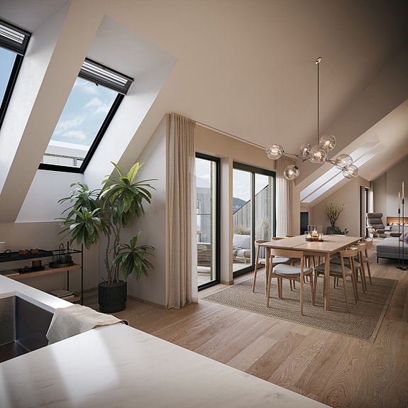Leilighet E402 er en unik og stor 3-roms leilighet med privat takterrasse og fantastisk sjøutsikt. Leiligheten har åpen stue- og kjøkkenløsning med utgang til 13,7 kvm stor takterrasse og 8,2 kvm stor balkong, to soverom, mellomgang, bad og entré.