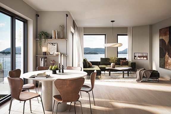 Store vindusflater, gode planløsninger og bruk av kvalitetsmaterialer kjennetegner de 77 leilighetene i Sjøbodene. Illustrasjon av leilighet D402.
