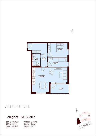 Bygg S1: 34 enheter i bygg som går over 5 hovedplan.