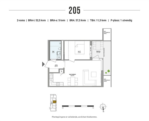 Fleksibel og arealeffektiv leilighet i 2. etasje. Leiligheten har ett romslig soverom, men kan også bygges med et litt mindre soverom til fordel for større stue. Alternativt kan det også lages et ekstra soverom eller kontor i stua, som tilvalg. Fra sofagruppen i stua vil det være utsikt mot Mjøsa og Vingnesåsen. Leiligheten har en romslig, delvis overdekket og skjermet balkong på 11,5 kvm, som delvis kan innglasses (tilvalg). Leiligheten har adkomst fra innvendig korridor. Det følger med
