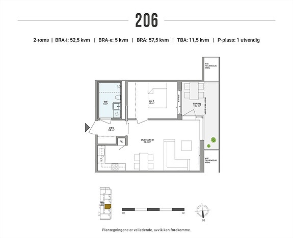 Fleksibel og arealeffektiv leilighet i 2. etasje. Leiligheten har ett romslig soverom, men kan også bygges med et litt mindre soverom til fordel for større stue. Alternativt kan det også lages et ekstra soverom eller kontor i stua, som tilvalg. Fra sofagruppen i stua vil det være utsikt mot Mjøsa og Vingnesåsen. Leiligheten får en romslig, delvis overdekket og skjermet balkong på 11,5 kvm, som delvis kan innglasses (tilvalg). Leiligheten får adkomst fra innvendig korridor. Det følger med 1 utvendig sportsbod.