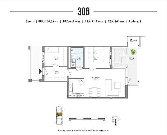 Denne effektive leiligheten i 3. etasje har en romslig entré med god garderobeplass. Det er to gode soverom, og leiligheten er gjennomgående og får godt med lys. Fra sofagruppen i stua vil det være fl ott utsikt mot Mjøsa og Vingnesåsen. Leiligheten får en stor, overdekket og skjermet balkong på 14 kvm, som kan innglasses i sin helhet (tilvalg). Badet får et skjermet inngangsområde. Leiligheten får adkomst fra svalgang med morgensol. Det følger med 1 sportsbod.