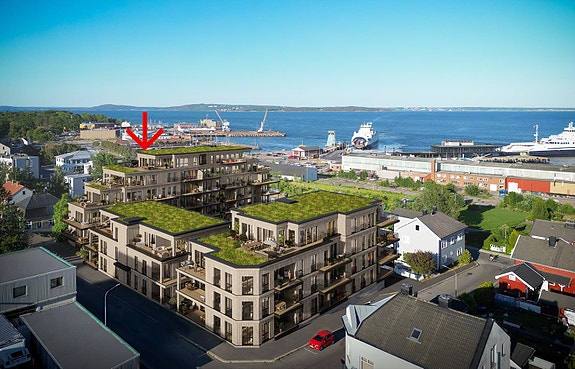 Dette er en leilighet som skiller seg ut i mengden. Boligen er på hele 140 Bra-i, har takterrasser på over 158 kvm. Stue og kjøkken på 61 kvm, 3 soverom, 2 bad og eget vaskerom. Direkte heisadkomst ned i garasjekjeller under bygget. Leiligheten har fjernvarme med vannbåren varme i alle oppholdsrom. Estimert ferdigstillelse sommeren 2026.