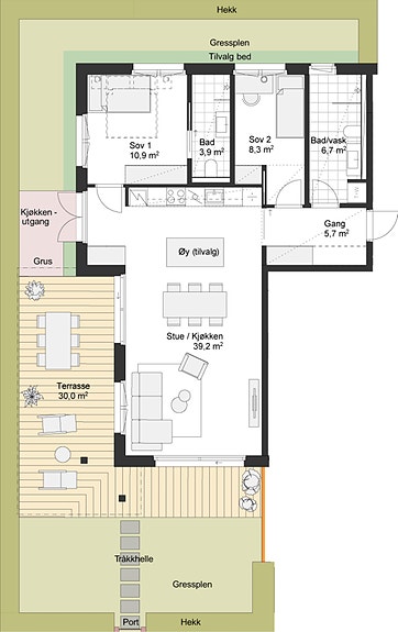 3-roms endeleilighet i 1. etasje med åpen stue- og kjøkkenløsning, romslig gang, to soverom, to bad, stor markterrasse og hage. Balansert ventilasjon sørger for godt inneklima og lave kostnader til oppvarming. Ny bolig kommer med fem års reklamasjonsrett og oppfølging fra utbygger. Boligen selges inkl. 1 parkeringsplass. Forutsatt ledige plasser kan ekstra parkeringsplass i garasjekjeller kjøpes. Ta kontakt med selger for mer informasjon.