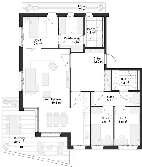 4-roms leilighet i 3. etasje med delvis separat stue og kjøkken, stor gang og entre, tre soverom, to bad, walk-in-garderobe og to balkonger. Balansert ventilasjon sørger for godt inneklima og lave kostnader til oppvarming. Ny bolig kommer med fem års reklamasjonsrett og oppfølging fra utbygger. Boligen selges inkl. 1 parkeringsplass. Forutsatt ledige plasser kan ekstra parkeringsplass i garasjekjeller kjøpes. Ta kontakt med selger for mer informasjon.