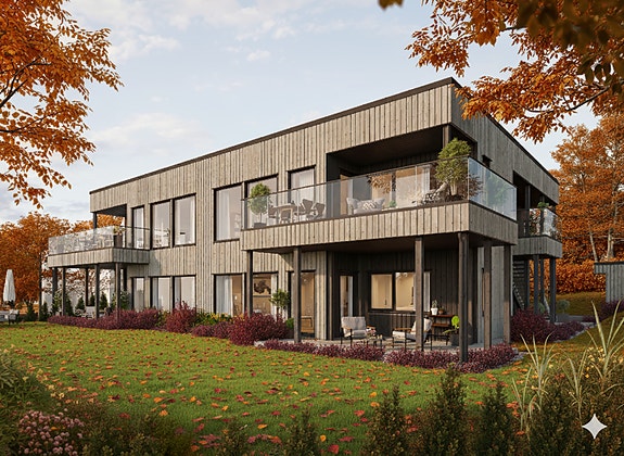 - Stor utvendig bod på 10 m² per enhet, som sikrer rikelig med lagringsplass.