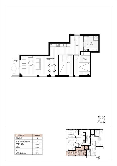 Leilighet i 2. etasje med god planløsning og egen balkong mot sør-vest. Leiligheten inneholder hall, bad med opplegg til vaskemaskin, 2 soverom, stue og kjøkken i åpen løsning med skyvedør ut til balkong. Leiligheten disponerer også carport og ekstern bod.