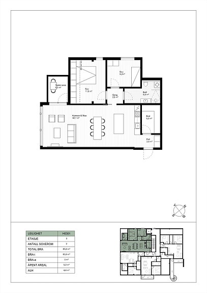 Flott, stor leilighet i 3. etasje med god planløsning og utgang til egen takterrasse mot sør-vest. Leiligheten inneholder hall, stor bod, soveromsgang, 2 soverom, bad med opplegg til vaskemaskin, stue og kjøkken i åpen løsning med utgang til takterrasse. Leiligheten disponerer også carport og ekstern bod.