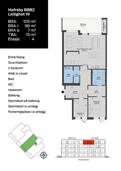- Parkeringsplass i lukket garasjeanlegg (gjelder ikke for leilighet 2,5,8,11 og 16)
