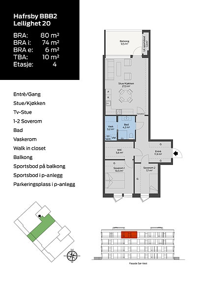 Bruksareal: 80 kvm, BRA-i: 74 kvm , BRA-e: 6 kvm , TBA: 11 kvm