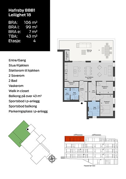 - Balkong på 43 m2 eller takterrasse på 107 m2