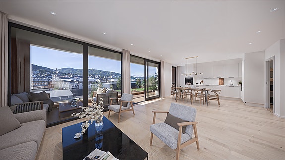 Stue / kjøkken med utgang til romslig overbygd balkong - illustrasjon