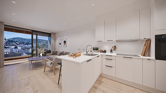 Fantastisk utsikt mot hagen, Grytøyfjellan, Samaåsen og Harstadåsen. Leiligheten har smart planløsning med åpen stue- og kjøkkenløsning og store vindusoverflater som bidrar til en luftig romfølelse. Leiligheten har soverom, bad/vaskerom, entre og praktisk innvendig bod.
