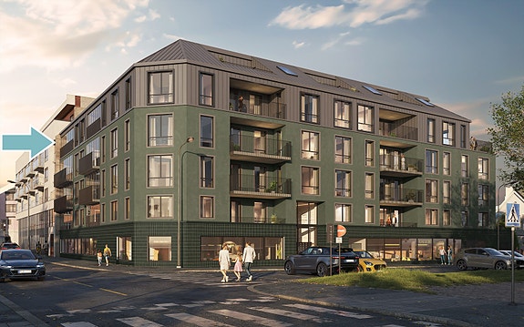 Her illustrasjon av bygget fra vest - Leiligheten ligger i 5 etasje og har store balkonger på begge sider. (kirken nå til høyre)