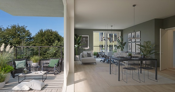 3D-illustrasjon av balkong og stue i leilighet 402. Utsikt er dermed ikke lik.