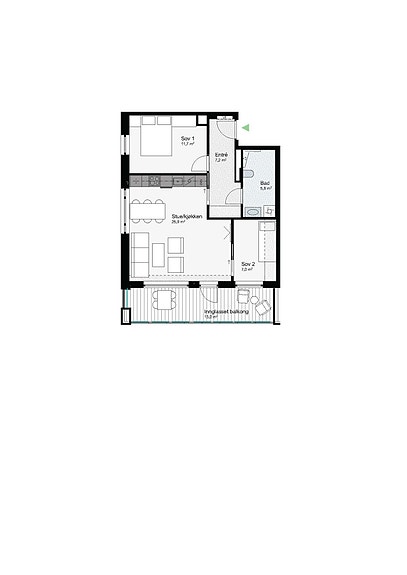 Hjørneleilighet med østvendt innglasset balkong. Leiligheten inneholder 2 soverom, åpen stue/kjøkken, entré med oppbevaringsplass og bad.