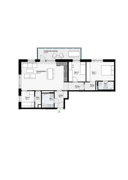 Gjennomgående hjørneleilighet med 3 soverom, 2 bad, entré, gang og bod. Stue/kjøkken på 35 kvm. Vestvendt balkong.