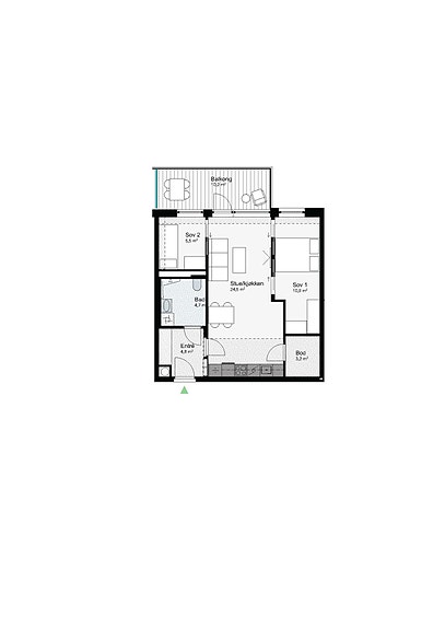 Åpen stue / kjøkken, 2 soverom, 1 bad og vestvendt balkong. Entre og bod med plass til oppbevaring.