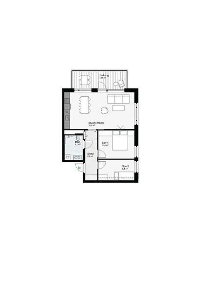 Åpen stue / kjøkken, 2 soverom, 1 bad og vestvendt balkong. Entre og bod med plass til oppbevaring.