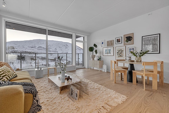 Fra stuen er det utgang til en innglasset balkong på ca. 10 kvm, hvor du kan nyte gode solforhold og flott utsikt over Tromsdalstinden, Tromsøysundet og alpinalegget et skjermet og anvendelig uteareal store deler av året.