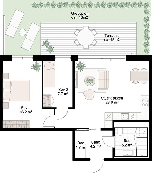 Lys 3-roms leilighet med store vindusflater og åpen stue- og kjøkkenløsning. Fra stue har du skyvedør ut til stor terrasse. To soverom. Delikat flisbelagt bad med plass til vaskemaskin.
