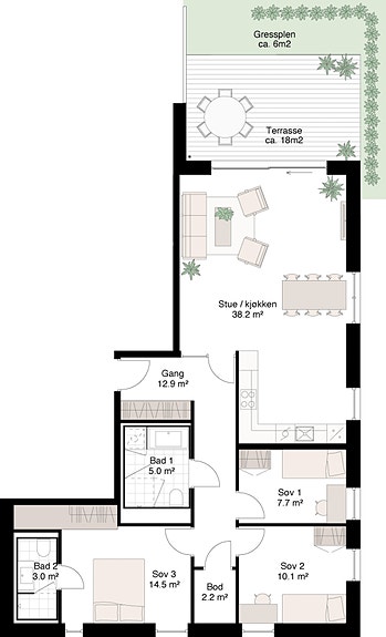 Stor og lys 4-roms leilighet med store vindusflater og markterrasse og liten hage. Leiligheten har åpen stue- og kjøkkenløsning med god plass til både spise- og sofagruppe. Tre fine soverom hvorav hovedsoverom har eget bad. Romslig gang med plass til garderobe.