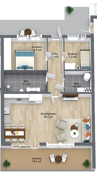 Boligen inneholder stue/kjøkken, to soverom, bad, entré, bod, balkong, sportsbod og overbygt parkeringsplass. I området er det tilgang til gjesteparkering og flotte lekeplasser, med bl.a. lekeapparat og benk.