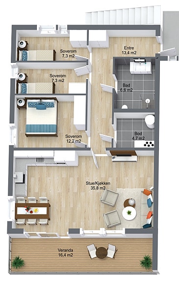 Boligen inneholder stue/kjøkken, tre soverom, bad, entré, bod, balkong, sportsbod og overbygt parkeringsplass. På området er det tilgang til gjesteparkering og flotte lekeplasser, med bl.a. lekeapparat og benk.