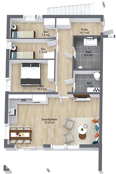 Boligen inneholder stue/kjøkken, tre soverom, bad, entré, bod, privat uteplass, sportsbod og parkeringsplass i carport. I området er det tilgang til gjesteparkering og flotte lekeplasser, med bl.a. lekeapparat og benk.