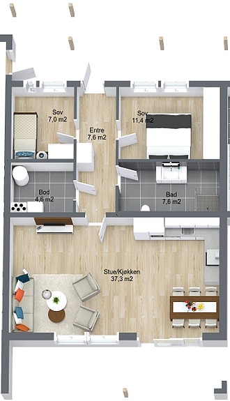 • Malte vegger og tak i valgfrie farger, der soverom og stue i tillegg kan leveres med kontrastvegg.