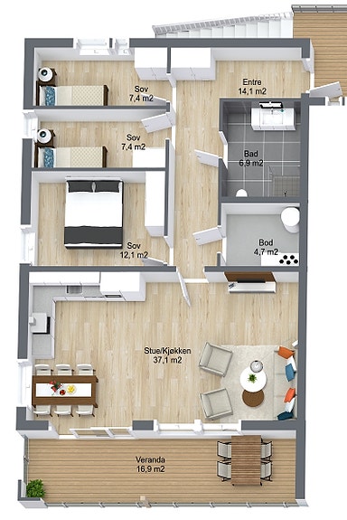 Dette er en flott leilighet på 95 m2 med høy standard. Boligen har 3 soverom og livsløpsstandard. Leiligheten har en åpen stue- og kjøkkenløsning med god takhøyde og store vindusflater, som gir et lyst og moderne preg. Fra stuen er det skyvedør ut til stor overbygt veranda med glassrekkverk. Bygningen inneholder et felles heis- og trappehus, som gir trinnfri tilkomst til alle leiligheter.