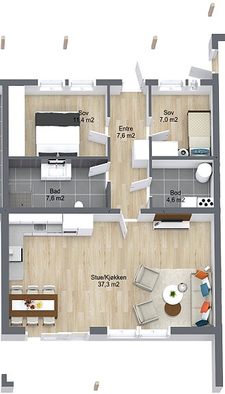 Boligen inneholder stue/kjøkken, to soverom, bad, entré, bod, privat uteplass, sportsbod og parkeringsplass i carport. I området er det tilgang til gjesteparkering og flotte lekeplasser, med bl.a. lekeapparat og benk.