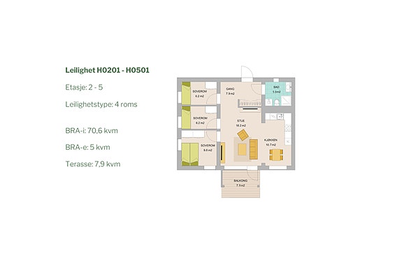 som slipper inn naturlig lys. Leiligheten har fokus på flere soverom på mindre areal, samt at nødvendige bofunksjoner er ivaretatt.