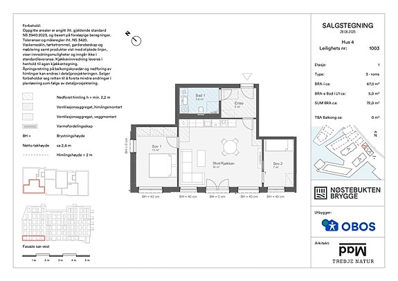 Boligenes varmetap og energibehov er dimensjonert i henhold til Byggeteknisk forskrift TEK 17. Ved overtagelse vil det bli utstedt energiattest, iht. enhver tid gjeldende lovverk. Boligene er foreløpig beregnet til energiklasse A, men endelig energiklasse blir beregnet ved utført trykketesting. Minimum klasse B blir levert. Det tas forbehold om at avvik kan forekomme, spesielt i leiligheter med mye vindusflate.