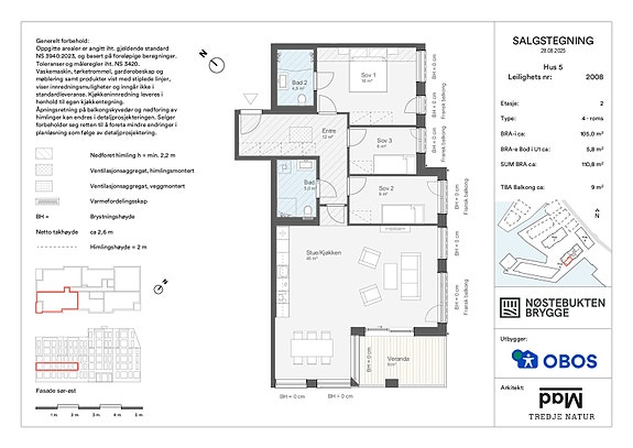 Boligenes varmetap og energibehov er dimensjonert i henhold til Byggeteknisk forskrift TEK 17. Ved overtagelse vil det bli utstedt energiattest, iht. enhver tid gjeldende lovverk. Boligene er foreløpig beregnet til energiklasse A, men endelig energiklasse blir beregnet ved utført trykketesting. Minimum klasse B blir levert. Det tas forbehold om at avvik kan forekomme, spesielt i leiligheter med mye vindusflate.
