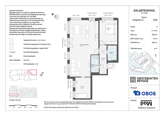 Boligenes varmetap og energibehov er dimensjonert i henhold til Byggeteknisk forskrift TEK 17. Ved overtagelse vil det bli utstedt energiattest, iht. enhver tid gjeldende lovverk. Boligene er foreløpig beregnet til energiklasse A, men endelig energiklasse blir beregnet ved utført trykketesting. Minimum klasse B blir levert. Det tas forbehold om at avvik kan forekomme, spesielt i leiligheter med mye vindusflate.